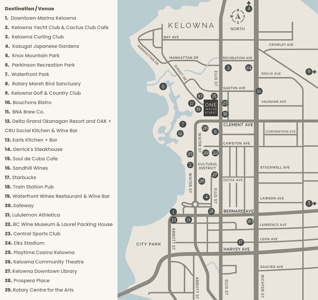 Living at ONE Water Street means being part of Kelowna’s downtown evolution. From morning coffee by the water to concerts at Prospera Place or evening walks through Waterfront Park, it blends urban convenience with the natural beauty the Okanagan is known for.