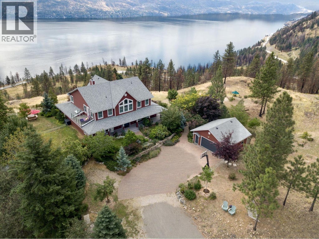 Perched high above Okanagan Lake and just 20 min from downtown Kelowna, this breathtaking family retreat offers a rare mix of privacy, luxury, and convenience. Tucked inside an exclusive gated community of only 12 estates, each with its own 10-acre parcel, this property boasts sweeping lake views and a setting that feels worlds away. Completely reimagined and fully renovated, the home blends modern comfort with thoughtful family functionality. The bright, open-concept layout features vaulted ceilings and floor-to-ceiling windows that capture the panoramic lake vistas from nearly every room. A chef-inspired kitchen includes a Thermador induction stovetop and double oven, perfect for everything from casual family meals to entertaining on a grand scale. With 4 beds, 3 baths, a home gym, multiple entertainment spaces, a wine/storage room, and 2 double garages (covered parking for 4, plus 400 amp service), it’s designed to handle everything from quiet evenings to big family gatherings. Outside, mature trees and colourful gardens frame the property, while cherry, pear, and apricot trees provide seasonal bounty. A sprawling 1,500 sq ft deck invites relaxation to the sound of a nearby waterfall. There’s room to add a pool or pickleball court, and endless space for kids to roam. Even the school bus stops conveniently at the gated entrance. Here, you’ll find the tranquility of rural living without giving up style or accessibility, a rare opportunity in the Okanagan. (id:3745)