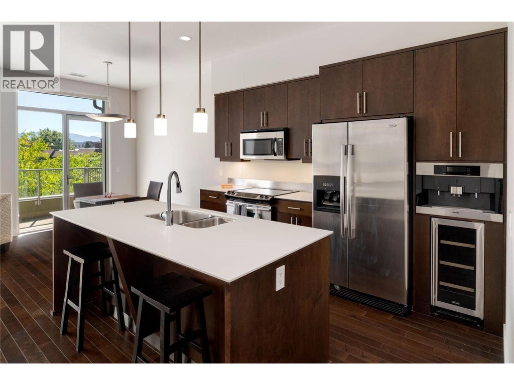 Experience elevated living in this 2-bedroom, 2-bathroom south-facing condo at Fuzion—where contemporary design meets resort-style amenities. Inside, the open-concept floor plan features high ceilings, rich hardwood flooring, and oversized windows that fill the home with natural light. The chef’s kitchen is equipped with stainless steel appliances, a built-in Miele coffee system, wine fridge, and a generous island that’s perfect for entertaining. The primary suite includes a spa-inspired ensuite with a walk-in shower, while the second bedroom offers flexibility for guests, a home office, or hobbies. All carpet in the home has just been replaced, offering a fresh and move-in ready feel. Everyday living is enhanced by in-suite laundry and secured parking with an extra-wide stall. This is a concrete building, ensuring a much quieter living environment. Residents also enjoy access to an outdoor pool & hot tub, a fitness centre, sauna, car wash bay, and meeting room. Perfectly located near shopping, dining, and downtown Kelowna, this home blends sophistication with everyday convenience. (id:3745)