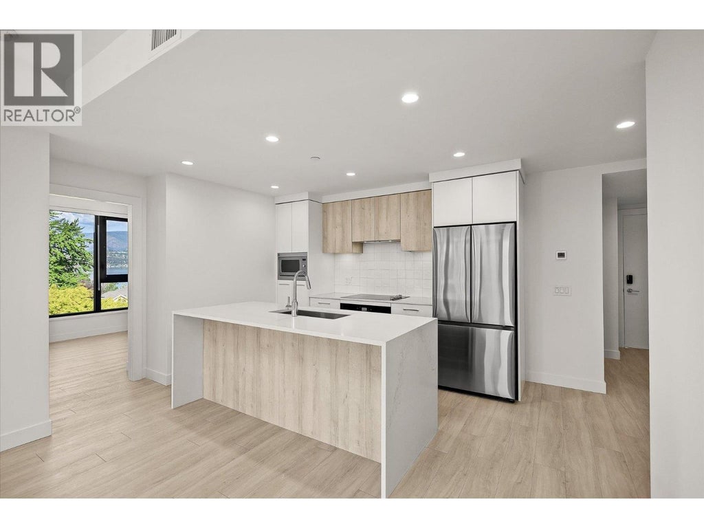 Live steps from the shoreline in Aqua Waterfront Village, an elevated lakefront community in Kelowna’s desirable Lower Mission. This home plan offers approx. 885 sq. ft. of intelligently designed interior space with two bedrooms, expansive windows and a spacious southwest facing balcony, offering natural light and lake views above the treetops. A split bedroom layout allows for privacy and flexibility. The kitchen features modern two-toned cabinetry, quartz countertops, under-cabinet LED lighting & a premium stainless steel appliance package, including a wine fridge. Enjoy luxury wide-plank vinyl flooring throughout the kitchen, living, dining area, and bedrooms, blackout roller shades in both bedrooms and an energy-efficient central heating and cooling system. The spa-inspired bathrooms showcase porcelain tile & quartz countertops. One secure parking stall (with the rare chance to buy a second stall), one storage locker, one bike locker are included. Amenities include: an outdoor pool & hot tub, gas fire pits & BBQ’s, a fireside lounge & co-working area, two-level fitness centre, pet wash & bike wash & maintenance area. Vacant & ready for quick possession. Only a 5% deposit required. Buyer to verify all details & measurements if deemed important. This is a mere posting. All offers must be written on the Developer’s CPS. Contact Siobhan at 250-317-0353 for more details, offer instructions & disclosures. GST APPLICABLE (id:3745)