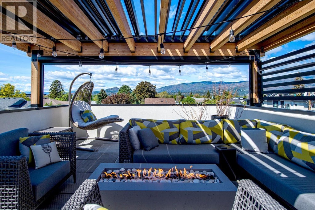 Stunning luxury townhome in the heart of Kelowna South, just steps to beaches, restaurants, shops, and cafes. This modern barn-style design features a spacious open layout, oversized windows, and a sun-soaked south-facing exposure. Enjoy 3 bedrooms, 2.5 baths, and upscale finishings throughout: vinyl plank and tile flooring, quartz counters, a 42” linear gas fireplace, and a fenced backyard. The highlight is a spectacular rooftop patio with panoramic mountain views, custom outdoor kitchen, Dekko fire pit, and automated pergola system. Thoughtfully upgraded with Lutron app-controlled lighting, custom blinds, Nest thermostat, wine fridge, custom cabinetry, river rock fireplace insert, garage storage lift, EV-ready garage, Ring security system, and more. Pets welcome—bring 2 dogs (breed restrictions apply) and 2 cats! This is your chance to own a one-of-a-kind home in one of Kelowna’s most desirable neighborhoods. (id:3745)