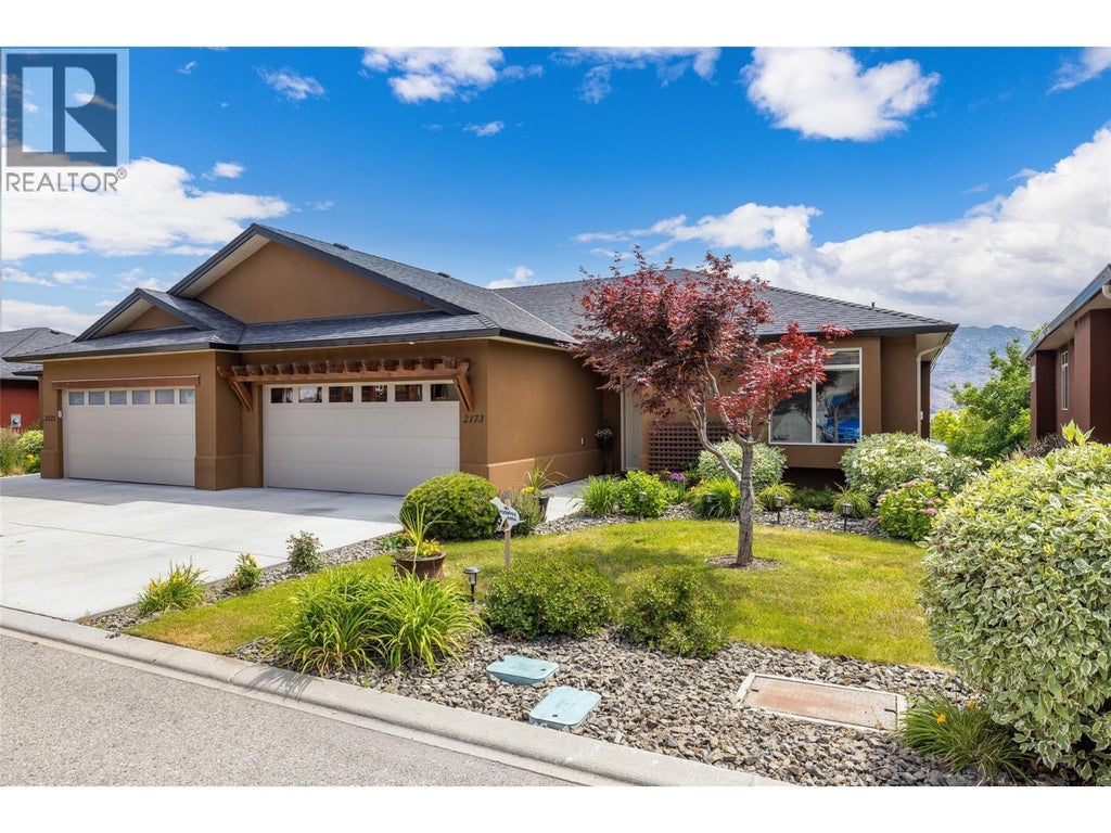 Welcome to this beautiful 4-bedroom plus den, 3-bathroom walkout rancher, showcasing breathtaking panoramic views of the lake and mountains in the highly desirable Sonoma Pines community. The kitchen is a chef’s delight, featuring granite countertops, tile backsplash, stainless steel appliances, and a sit-up island. The dining area opens to a spacious covered deck with two privacy screens and an awning—perfect for outdoor entertaining. In the living room, enjoy 10-foot ceilings and hardwood floors that create an airy, elegant feel. The primary suite offers a walk-in closet and a 3-piece ensuite with granite counters, while a den, laundry room, and double garage complete the main level. The fully finished lower level is designed for relaxation, with luxury vinyl flooring, a family room with patio access, two bedrooms, a flex room/bedroom, a 3-piece bath, and ample storage. Residents of Sonoma Pines enjoy access to a fantastic clubhouse with a gym, pool tables, shuffleboard, library, full kitchen, and event space. This quiet, gated, and beautifully maintained community has no age restrictions and is ideally located near Gellatly walkway, beaches, golf, wineries, restaurants, shopping, and hiking. Added benefits include no Property Transfer Tax or Speculation Tax, and the lease is prepaid until 2102. Quick possession available! (id:3745)