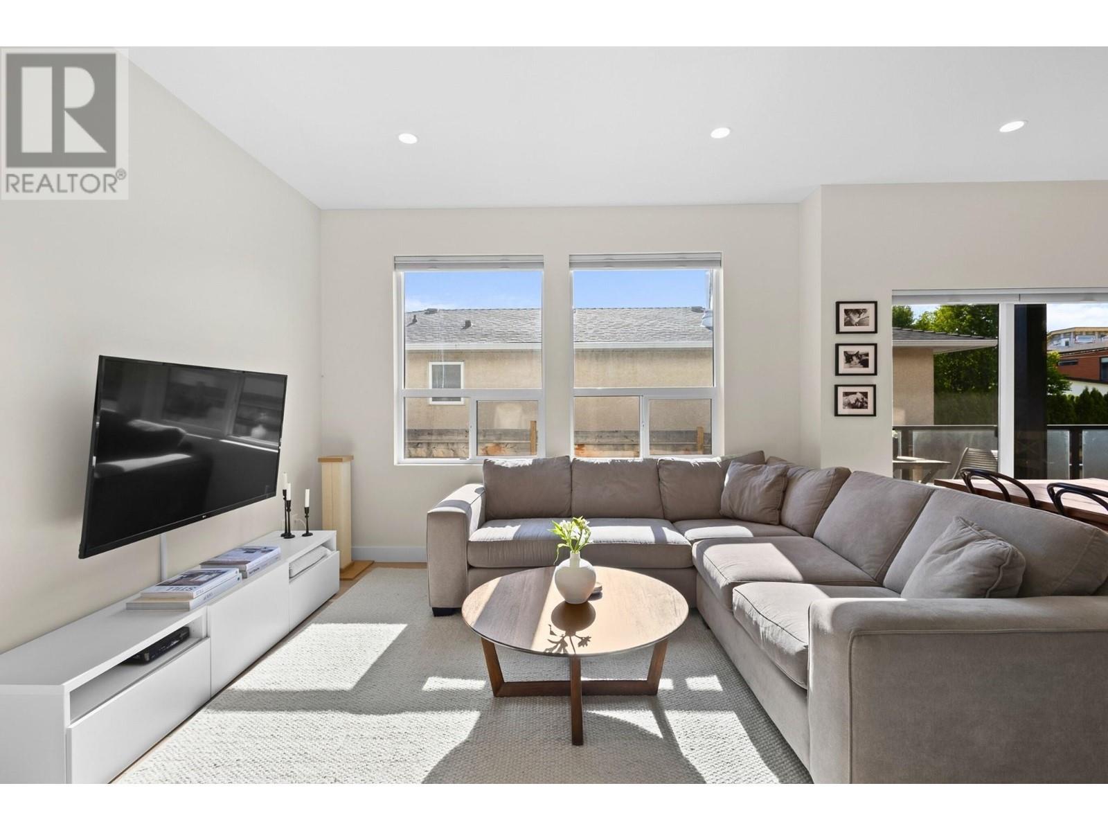HOT LOCATION, NO MTHY STRATA FEES & BELOW ASSESSED VALUE! DISCOVER THIS QUIET 4-PLEX TOWNHOME IN SOUTH KELOWNA NEAR THE BEACH, PANDOSY VILLAGE, PARKS & KGH HOSPITAL. A 2018-BUILT - 2 STOREY WITH ROOF TOP DECK PLUS BASEMENT & A PRIVATE ENCLOSED GARAGE WITH DRIVEWAY. Pets & long term rentals allowed; and more space than the average 4-plex construction in the area, nestled near many restaurants & boutiques & medical facilities. This functional 1540+sqft townhome redefines modern living, boasting a plethora of premium features that include expansive outdoor living with a private rooftop deck, primed for hot-tub & gas BBQ/firetable connection, along with another main floor deck right off from the kitchen. Upstairs offers 2 bedrooms, 2 bathrooms, & laundry facilities on the upper level, while the fully finished basement serves as a multi-functional 3rd bedroom/flex area with additional bathroom. Entertain on the main level with an open concept layout, engineered oak hardwood floors, a built-in dining espresso bar with beverage fridge, gourmet kitchen with stainless appliances & a 5-burner gas range stove. An above average finishing that includes quartz countertops, 9' lacquer kitchen cabinets, a 3-zone home audio system with amplifiers, central vacuum, tankless hot water on demand, frameless glass showers, & epoxy garage floor with a glass/aluminum garage door. Book your private viewing today. (id:3745)